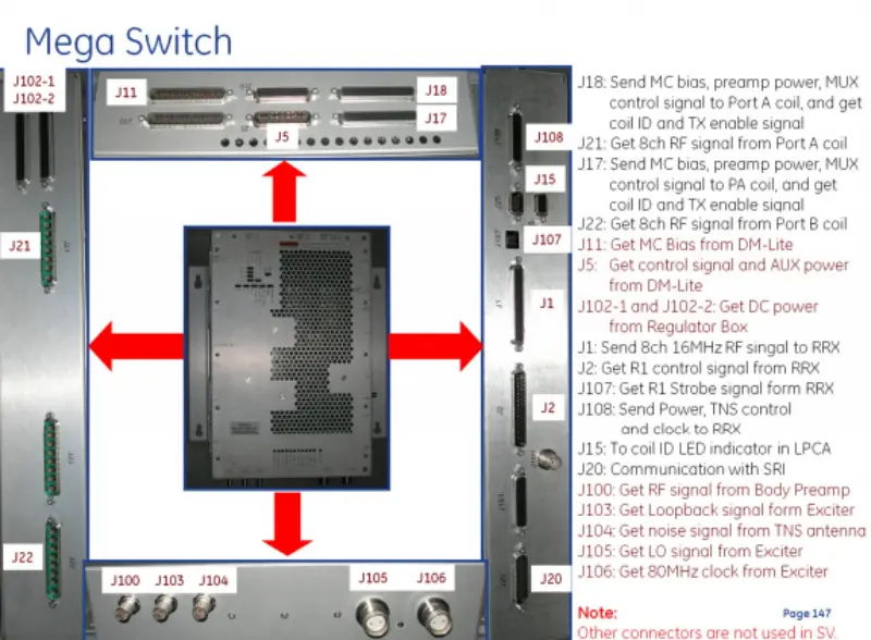 2.Port A (J18, J21): Sender MC-bias, forforsterkereffekt og MUX-kontrollsignaler til spolen; mottar spole-ID, TX-aktiveringssignal og 8-kanals RF-signal.